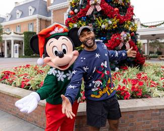 Award-winning actor Omari Hardwick was feeling festive recently at Walt Disney World Resort in Lake Buena Vista, Fla. Hardwick and Mickey Mouse put on their best holiday sweaters for a photo in front of the Christmas tree at the American Adventure Pavilion at EPCOT on November 23, 2022. Hardwick was visiting the theme park with his family to kick off the holiday season. (Courtney Kiefer, photographer)