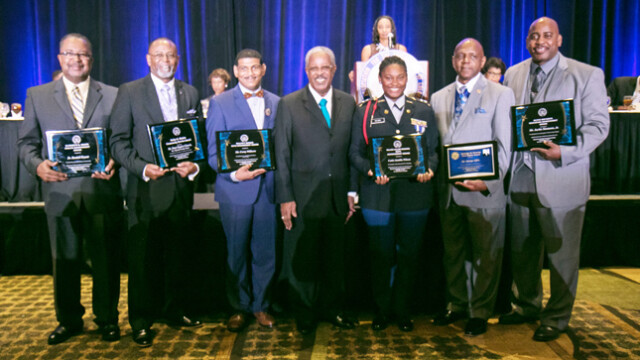 Pictured l-r with NAACP President Isaiah Rumlin are award winners: Dr. Randall Bryant (Elizabeth Means Health Award), Rev Reginald Gundy, Mt. Sinai Bptst Church (Sallye B Mathis Community Service Award), Corey Wilborn (Willie F Dennis Civic Engagement Award), NAACP President Isaiah Rumlin, Cadet Jamilia Wilson (Major Allan Rogers ROTC Award), George Gillis (Rutledge H Pearson Civil Rights Award) and Jackie Simmons, Jr. (Olivia Gay-Davis Education Award).