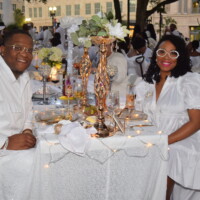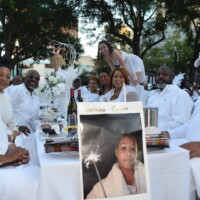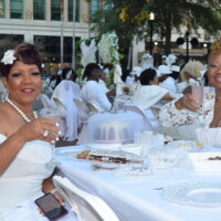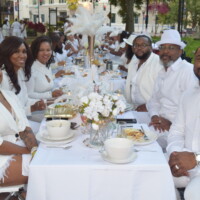 At 3 p.m. participants were informed that the location would be James Weldon Johnson Park located in the heart of downtown. Marching to their own beat, participants trail of white garments and carts holding food baskets, table décor and seating for a “chic picnic” in a public place. Each year attendees are able to create their own decorum with elegance and flair in the designated public place that serves as a background for a high profile evening event. Diners are required to provide their own food, tables, chairs and tablecloths. Popping champagne corks, the napkin wave, shining sparkles and grooving to the band is the gateway to socializing during the event.