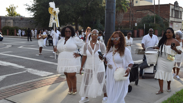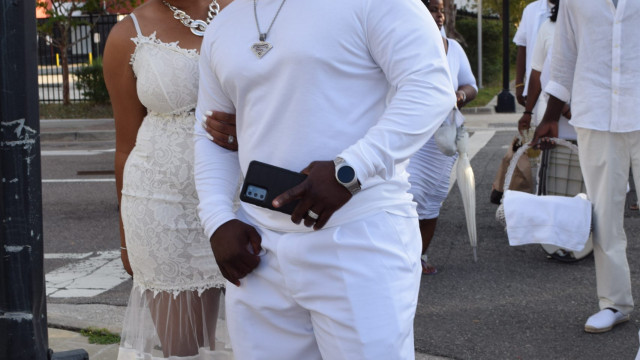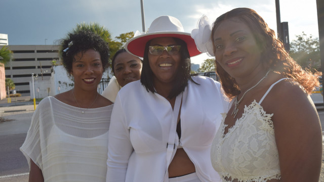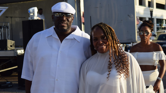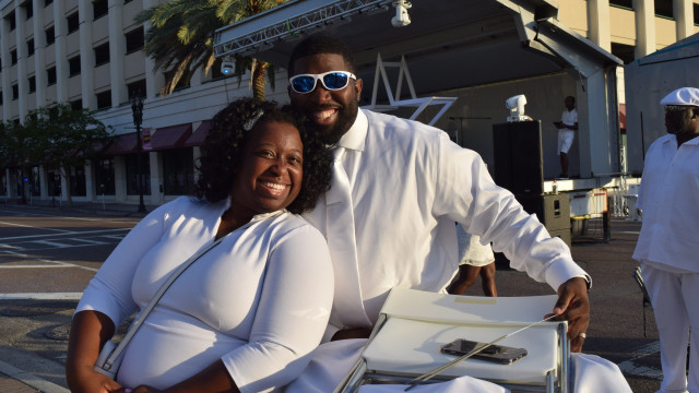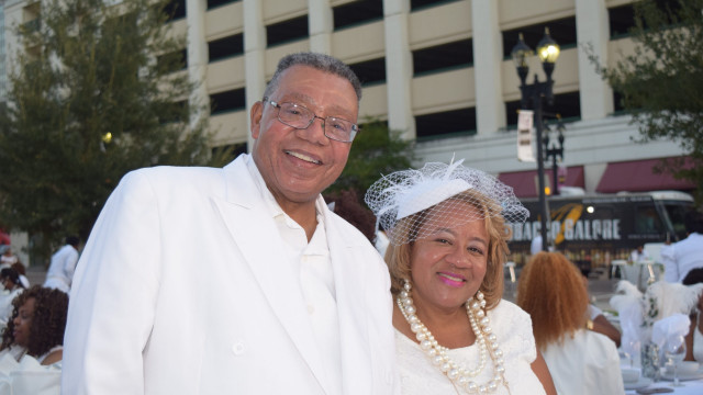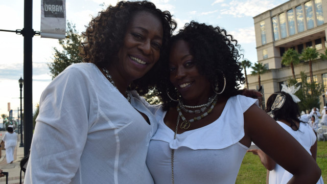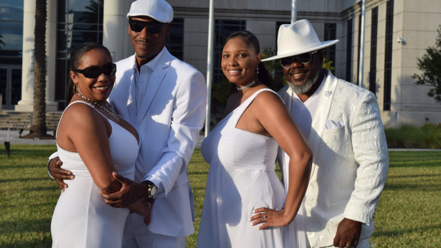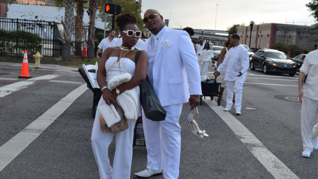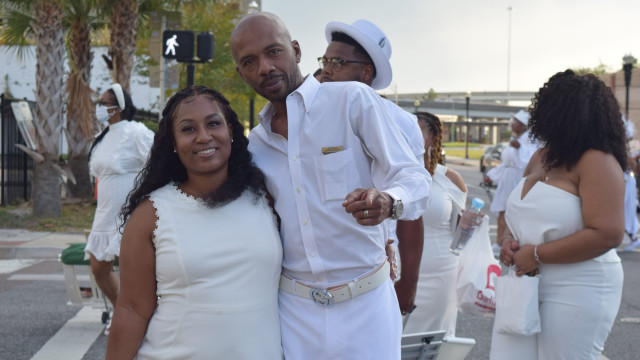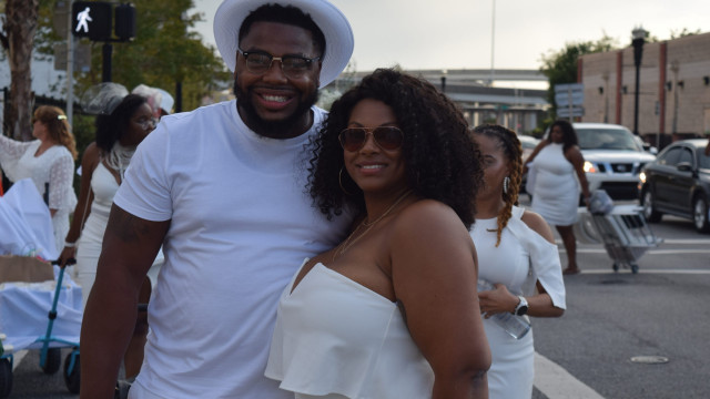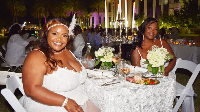 The iconic Dîner En Blanc found its way back to downtown this month. The all white affair kicked off over the weekend with diners filling up Broad, Clay, and Pearl streets, headquartered at the Duval County Court of Clerks. Guests were greeted upon arrival by violinist Richmond Punch and DJ EMCEE playing friendly musical tunes. Toting elegant white picnic baskets filled to the brim with gourmet treats, guests set up their tables and chairs and created unique table decor designs, including elegant tablescapes, miniature lit Eiffel Towers, lanterns and sparkling lights. The food was catered by Pink Salt Restaurant. After all table were perfected, the beginning of dinner was signaled by the traditional waving of white linen serviettes. As the night went on, diners were not deterred from the clouds overhead that poured a heavy rain forcing the diners from their tables to the doorsteps of the Courthouse. “All the guests waited for the rain to stop and we watched old friends began to catch up on their memories while several other diners looked for bottle openers for their champagne,” said organizer Host Markesha Fuller.