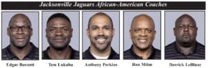 On a local level, the Jacksonville Jaguars have a number of Black coaches including Edgar Bennett -Wide Receivers Coach; Tem Lukabu – Linebackers Coach; Anthony Perkins – Defensive Backs Coach; Ron Milus – Secondary Coach and Derrick LeBlanc – Assistant Defensive Line Coach.