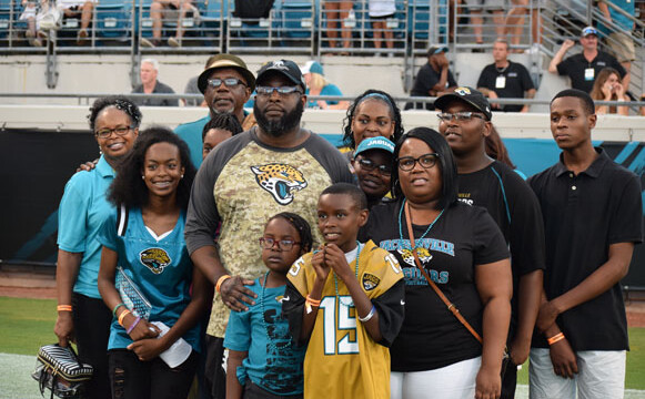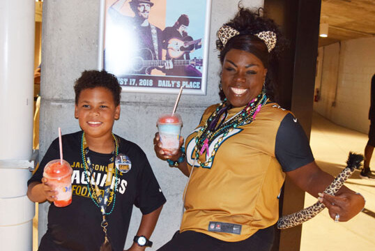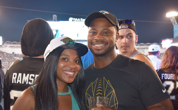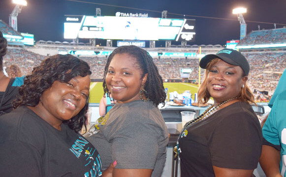 Prior to the start of the Jaguars’ preseason home opener four prominent Jacksonville players decided to stay in the locker room during the singing of the national anthem. Pro Bowl linebacker Telvin Smith, All-Pro cornerback Jalen Ramsey, former first-round pick Leonard Fournette and fourth-year running back T.J. Yeldon were not on the field with their teammates during the anthem. The group’s decision to elude the on-field presentation comes after months of controversy regarding the handling of anthem protests. Shown are fans Tyesha Daily and Kim Jefferson.