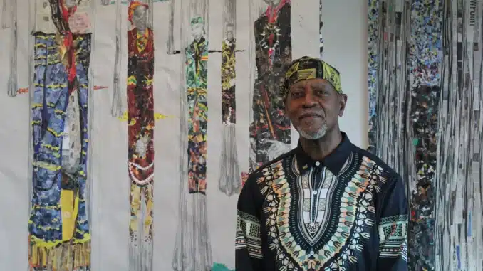 Humes Jr. stands in front of work created during his second residency with AIRIE. (Sarah Perkel for The Miami Times)