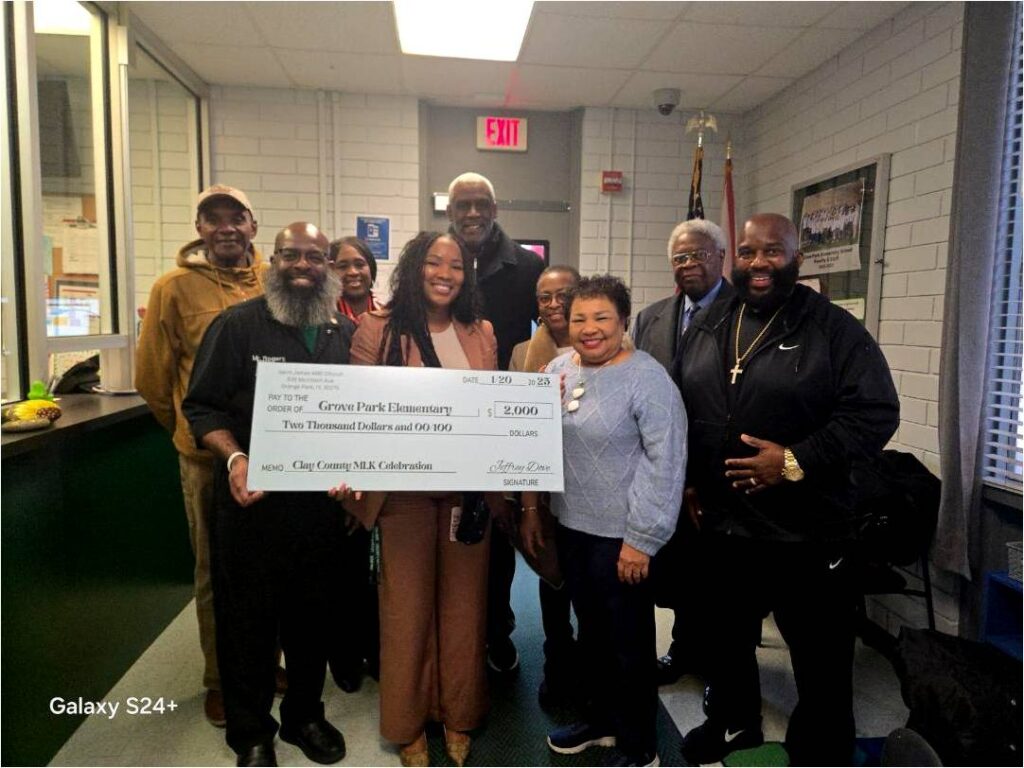 The Clay County Martin Luther King Day of Service presented Shadreka Smith principal of Grove Park Elementary School $2000 to assist with the schools education program. The Day of Service honored Dr. Martin Luther King., Jr.’s impact on the world. During the day of service volunteers assisted with food distribution bringing together food centers, churches, fraternities, sororities and nonprofit organization to serve together for a cause.