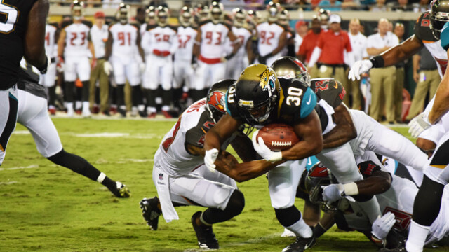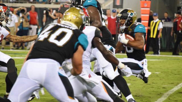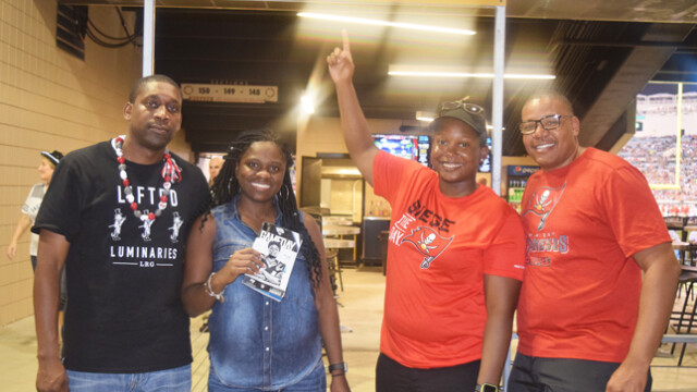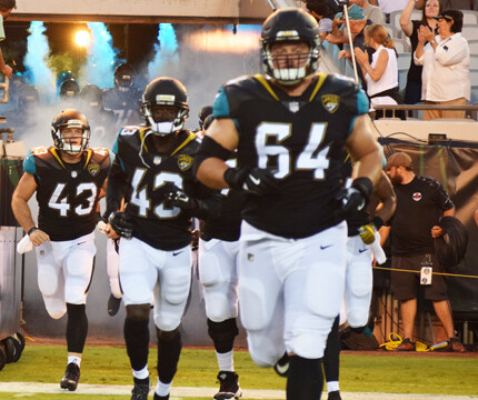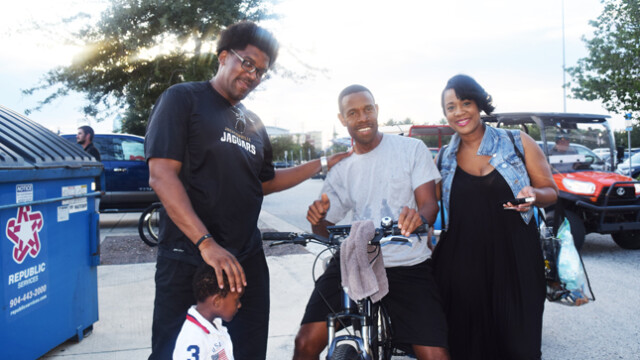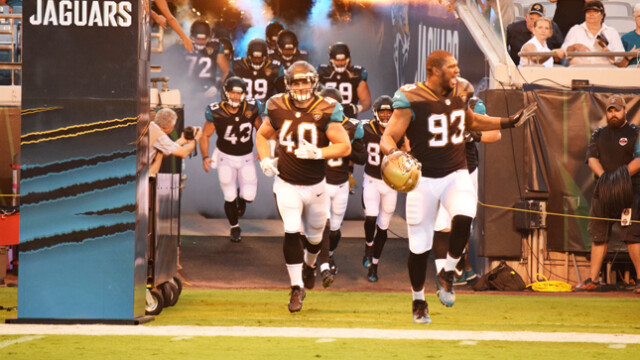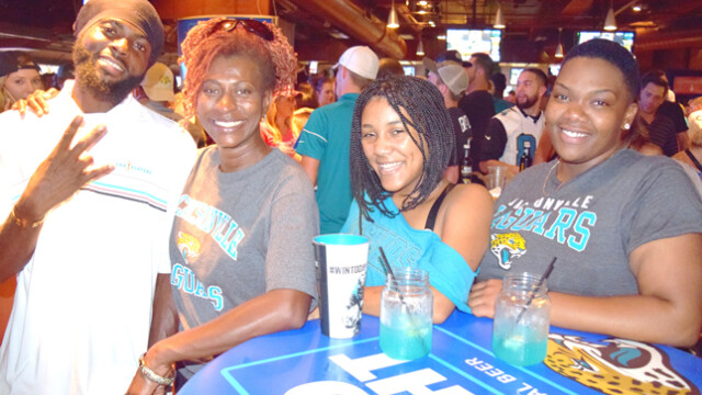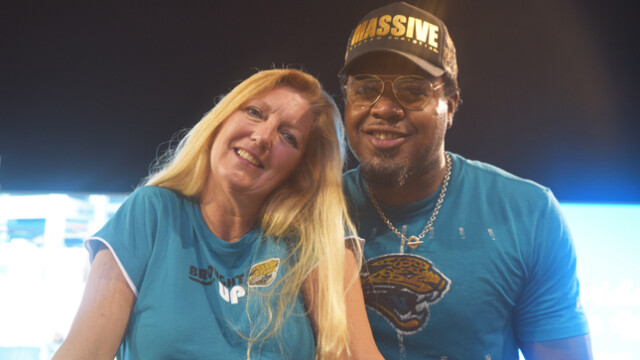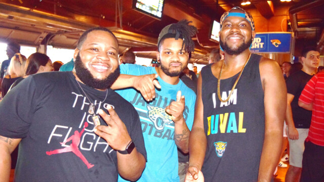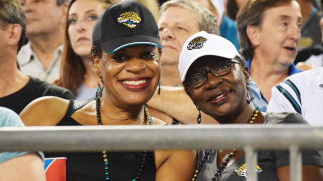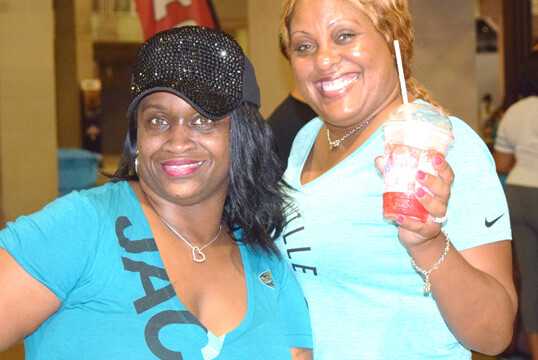 Shown giving Jags fans Tia Aguinaldo and Barbara Watkins a dose of game time entertainment in front of the stadium were saxophonist Marques Wright and Tim Turner playing his makeshift drums. The Jaguars preseason game was attended by thousands of fans eager to witness the home team continue their winning streak. Quarterback Blake Bortles’ badly missed passes to wide receiver Allen Robinson did not impress fans. The Jaguars were defeated in the preseason game 8 -12 to the Tampa Bay Buccaneers. This week the Jaguars face off against the Carolina Panthers. The regular season will begin Sunday, September 10th when they travel to play the Houston Texans.