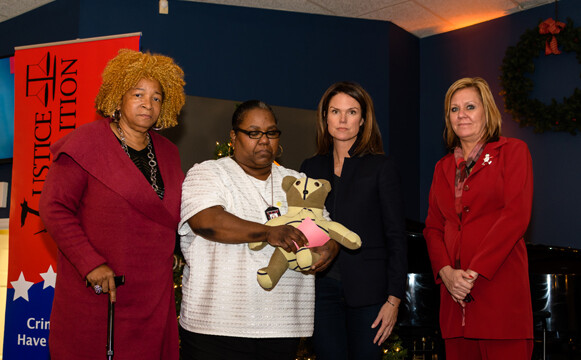 Featured guest State Attorney Melissa Nelson presented the surviving family members with a Teddy Bear that had been made from clothing that had been worn by the victims when they were still with the family members. The cuddly bear dolls were handcrafted by Donna Lappin whose goal is to give comfort and a renewed sense of security to people who truly are in need of a Christmas hug! In addition, a Bible with the victim’s name were given out with the bears. The celebration ended with prayer of love and hope from pastor Amos Bankhead, “despite the dampness of the weather, the warmth inside was a shared commonality,” she said.