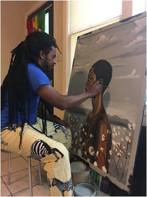 By Cristin Wilson – With his waist length dreadlocks tied back his gaze is fixated on the canvas against his wall. This is his latest piece. It doesn’t have a name, but he’s been working on it for the past week. Surrounded by others, it has his full attention. He’s created a regal beauty with coffee colored skin and short natural hair, though he mentions that could change. Not wearing any clothes she’s looking straight ahead with a determined look surrounded by cotton. Her face tells you that her life hasn’t been easy, but then again neither has Adrian Rhodes.