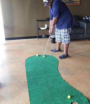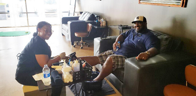 Not limiting itself to just individual services, Aficionado Grooming Lounge also is perfect for corporate retreats and team building events.  “This is a real man cave, I can hang with my buddies, play pool, get groomed and pampered and relax after a hard week,” says Randy Moore shown being serviced by technician Sharice Blount.