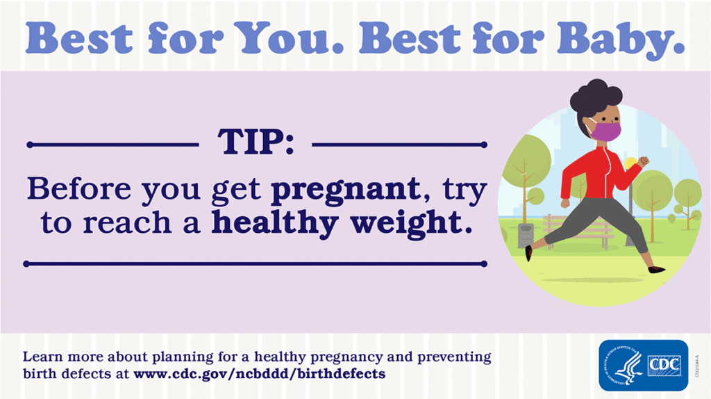 - Are you thinking about getting pregnant soon? Is reaching a healthy weight one of your new year’s resolutions? What’s best for you is also best for your baby! Talk with your doctor about ways to reach and maintain a healthy weight before you get pregnant. https://www.cdc.gov/ncbddd/birthdefects/prevention-month.html