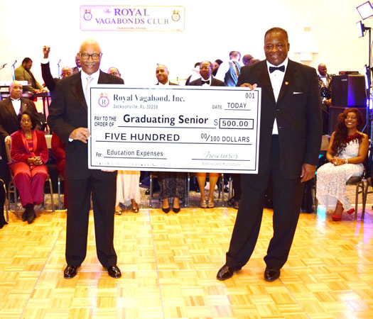 Entertainment for the evening was presented by the Special Formula band, playing the sounds of Motown, Jazz and top 40 hits. Gift bags were placed throughout the ballroom with Mardi Gras mask for guests to peruse and create a mystical appearance to their mate or date. Royal Vagabond members proudly entered the ballroom escorting their dates and hosted a program detailing their community efforts to award scholarships to deserving Duval county high school students. This year, the Royal Vagabonds presented four five hundred dollar scholarships to eligible graduating seniors. Scholarship criteria include completing an application, writing an essay and grade point average.