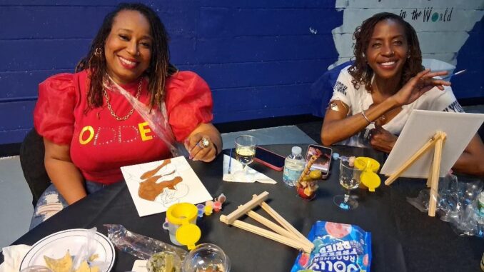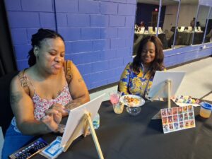 Shown are guests Jaynaya Barlow and Ketaya Vega painting their selected canvas.
