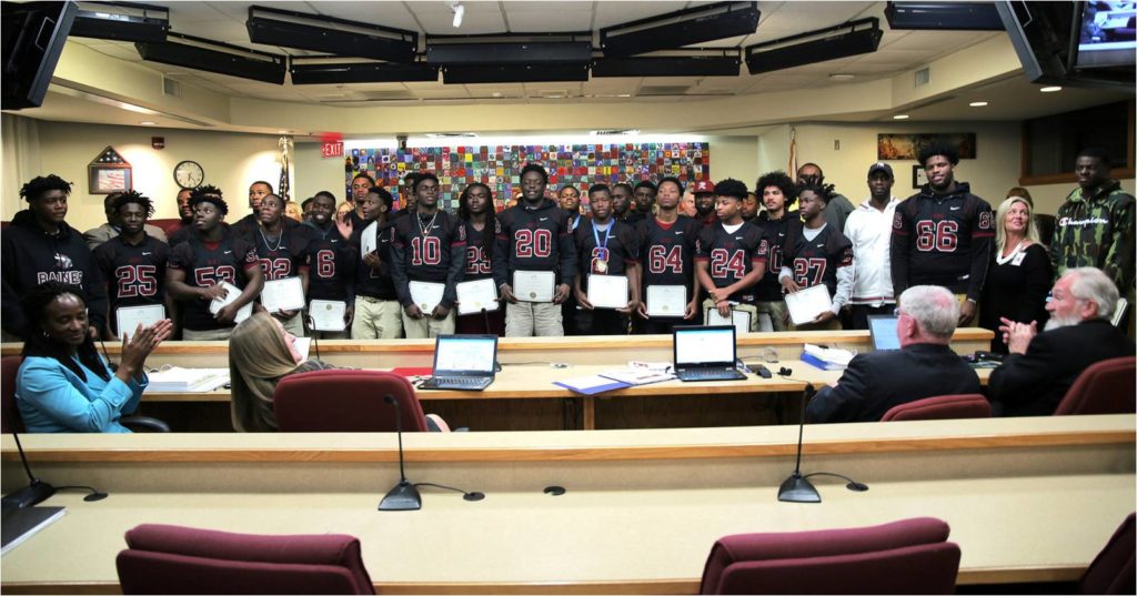 The Raines Vikings football team was recognized by the Duval County School Board during its monthly meeting this week. The Vikings made history this past December when they beat out the Cocoa Tigers for the Class 4A Florida High School Athletic Association Championship. The team took home a championship trophy to place alongside the one first gained in 1997 making them the only school in Duval County to do so. Pictured is the Raines Vikings Football team accepting their award in front of DCPS board members.